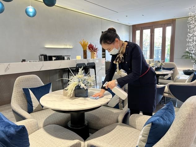 一客一消,守護安全:客人離開后須對落座區域進行消毒。洽談桌、樣板間、洗手間等所有空間堅持一客一消毒。